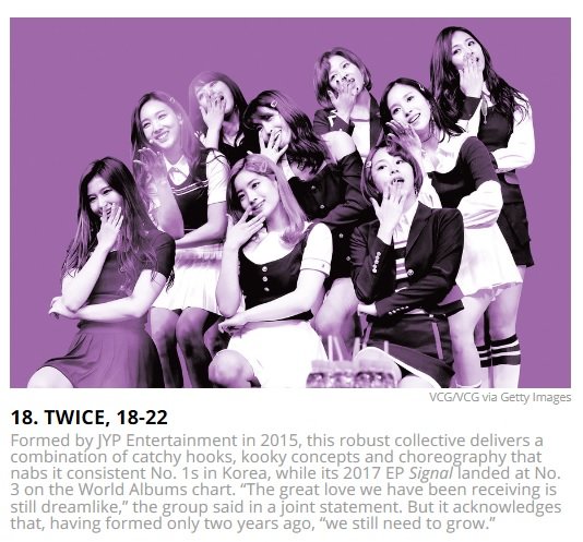 빌보드는 28일(현지시간) \'21 Under 21 2017: Music\'s Next Generation\'라는 타이틀의 기사를 게재하며 트와이스를 18위로 소개했다.