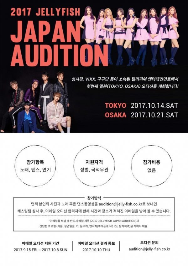 젤리피쉬엔터테인먼트(이하 젤리피쉬)가 ‘2017 젤리피쉬 재팬 오디션(2017 JELLYFISH JAPAN AUDITION)’이라는 이름으로 일본 도쿄와 오사카 지역에서 첫 번째 공개 오디션을 열고 글로벌 인재 영입에 나선다. 최근 빅스 LR과 구구단 오구오구의 성공적인 유닛 활동을 마친 가운데 알려져 개최 소식에 관심이 집중되고 있다.