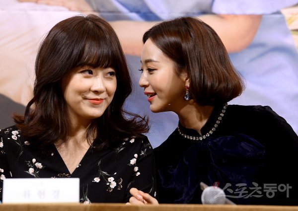 배우 류현경과 한예슬(오른쪽)이 29일 서울 강남구 논현동 임피리얼 팰리스 서울에서 열린 MBC 새 월화드라마 ‘20세기 소년 소녀’ 제작발표회에 참석해 귓속말을 나누고 있다.