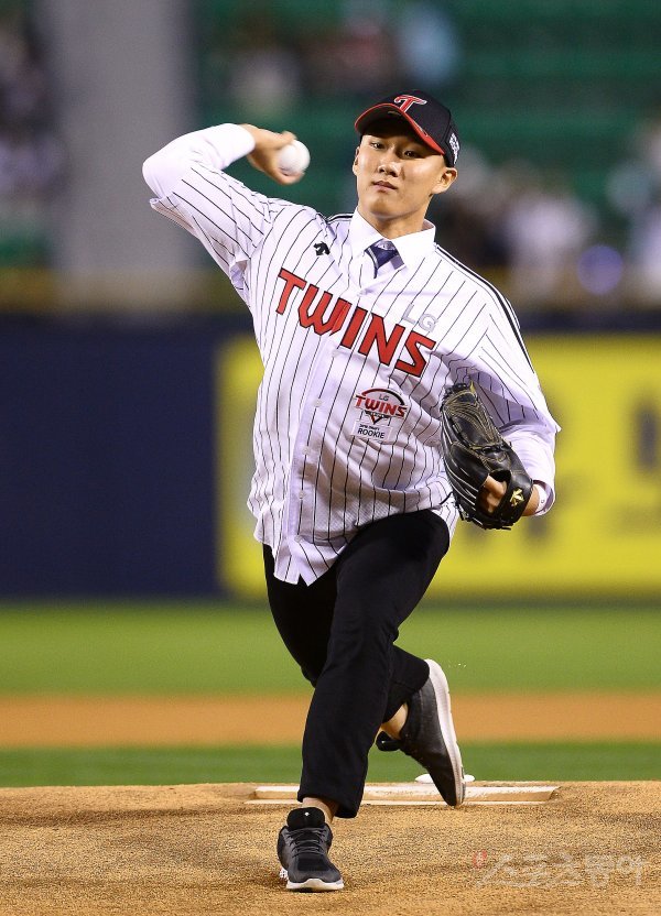 29일 서울 잠실야구장에서 ‘2017 타이어뱅크 KBO리그’ LG트윈스와 두산베어스의 경기가 열렸다. 경기를 앞두고 열린 시구 행사에서 1차 지명된 신인 김영준이 힘차게 공을 던지고 있다.