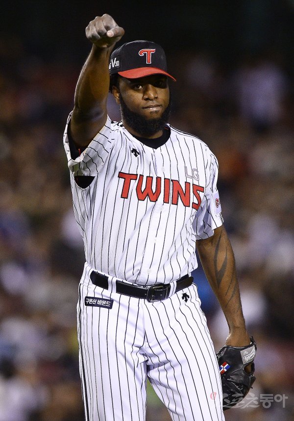 29일 서울 잠실야구장에서 ‘2017 타이어뱅크 KBO리그’ LG트윈스와 두산베어스의 경기가 열렸다. 4회초 2사 만루에서 두산 양의지를 좌익수 플라이로 처리하며 위기를 넘긴 LG 선발 소사가 주먹을 불끈 쥐며 기뻐하고 있다.