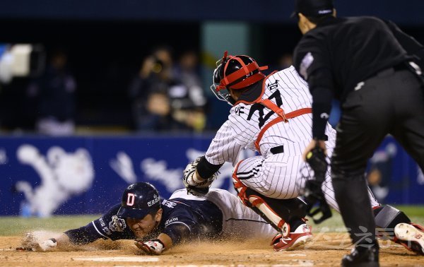 29일 서울 잠실야구장에서 ‘2017 타이어뱅크 KBO리그’ LG트윈스와 두산베어스의 경기가 열렸다. 5회초 2사 1,2루에서 두산 최주환이 김재환의 안타 때 홈으로 쇄도했으나 태그아웃 당하고 있다.