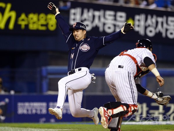29일 서울 잠실야구장에서 ‘2017 타이어뱅크 KBO리그’ LG트윈스와 두산베어스의 경기가 열렸다. 5회초 1사 만루에서 두산 오재원이 민병헌의 2타점 적시타 때 홈으로 쇄도, 세이프 되고 있다.