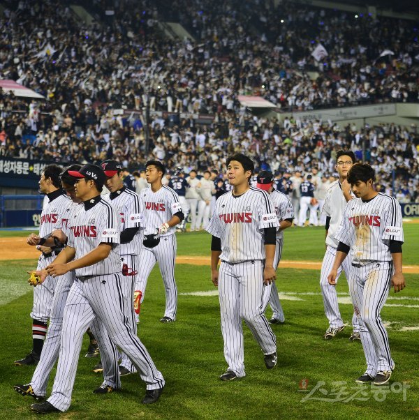 29일 서울 잠실야구장에서 열린 ‘2017 타이어뱅크 KBO리그’ LG트윈스와 두산베어스의 경기에서 두산이 5-3으로 승리했다. 트레직 넘버 1을 남겨두고 있던 LG는 이날 패배로 포스트시즌 진출에 실패했다. 경기 후 LG 선수들이 굳은 표정으로 그라운드를 빠져나가고 있다.