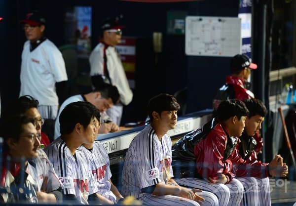 29일 서울 잠실야구장에서 ‘2017 타이어뱅크 KBO리그’ LG트윈스와 두산베어스의 경기가 열렸다. 9회말 2사 1루에서 LG 더그아웃 선수들이 굳은 표정으로 경기를 지켜보고 있다.