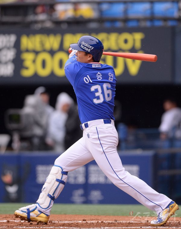 1일 서울 잠실야구장에서 ‘2017 타이어뱅크 KBO리그’ LG트윈스와 삼성라이온즈의 경기가 열렸다. 2회초 선두타자로 나온 삼성 이승엽이 2루타를 치고 있다.