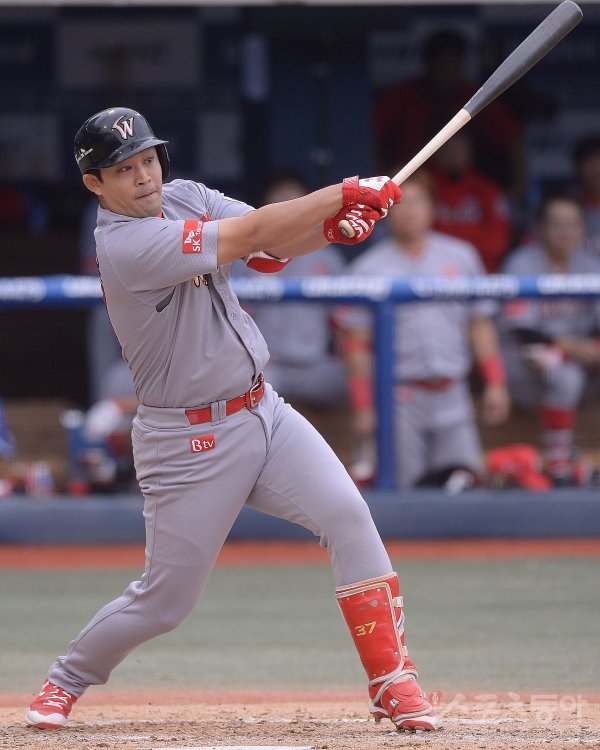 5일 창원 마산야구장에서 ‘2017 KBO 포스트시즌’ 와일드카드 결정전 1차전 NC다이노스와 SK와이번스의 경기가 열렸다. 3회초 2사 1,2루에서 SK 정의윤이 적시타를 치고 있다.