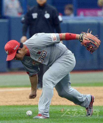 5일 창원 마산야구장에서 ‘2017 KBO 포스트시즌’ 와일드카드 결정전 1차전 NC다이노스와 SK와이번스의 경기가 열렸다. 5회말 1사 SK 최정이 NC 김성욱의 3루수 앞 땅볼을 놓치며 내야 안타를 허용하고 있다.