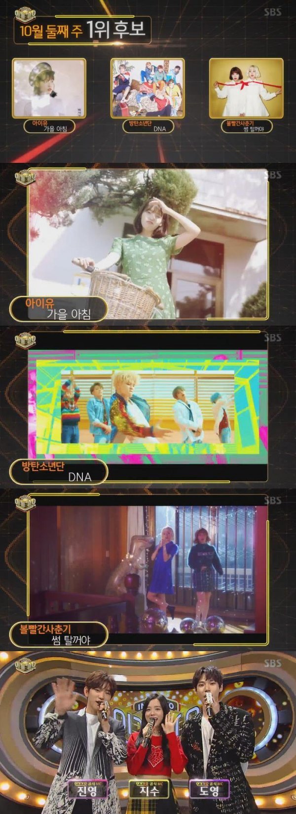 8일 \'인기가요\'에 따르면 아이유 \'가을아침\', 방탄소년단 \'DNA\', 볼빨간 사춘기 \'썸탈거야\'가 10월 둘째 주 1위 경쟁을 벌인다.