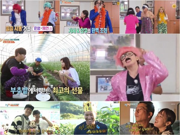 8일 방송된 ‘1박 2일’는 강원도 홍천 유치리 마을로 떠난 ‘2017 청춘불패 특집’ 두 번째 이야기가 그려졌다. 이날 ‘1박 2일’은 ‘청춘불패’와의 컬래버레이션으로 모두 12명 멤버가 프로 재롱러와 일일 일꾼으로 변신해 유치리 웃음꽃을 폭발시켰다.