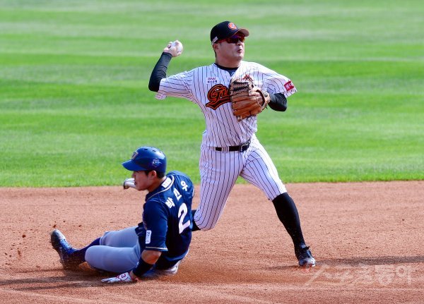 9일 부산 사직야구장에서 ‘2017 타이어뱅크 KBO리그’ 롯데 자이언츠와 NC 다이노스의 준플레이오프 2차전 경기가 열렸다. 1회초 1사 1루에서 NC 나성범의 내야땅볼 때 1루 주자 박민우가 2루에서 롯데 문규현에게 포스 아웃되고 있다.