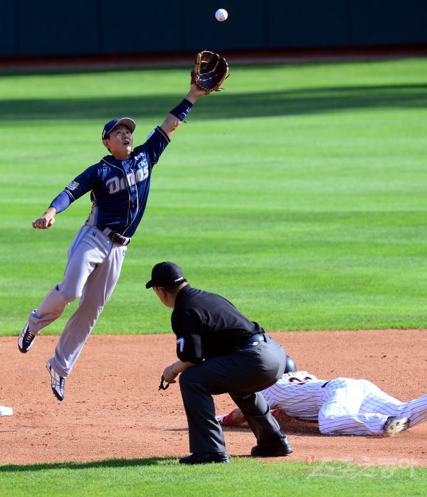 9일 부산 사직야구장에서 ‘2017 타이어뱅크 KBO리그’ 롯데 자이언츠와 NC 다이노스의 준플레이오프 2차전 경기가 열렸다. 3회말 2사에서 롯데 이대호 타석 때 1루 주자 손아섭이 2루 도루에 성공하고 있다.