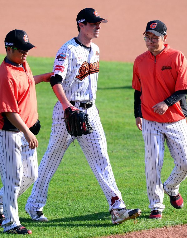 9일 부산 사직야구장에서 ‘2017 타이어뱅크 KBO리그’ 롯데 자이언츠와 NC 다이노스의 준플레이오프 2차전 경기가 열렸다. 6회초 무사에서 롯데 선발 레일리가 NC 나성범의 부러진 배트에 맞은 뒤 부상으로 교체되고 있다.