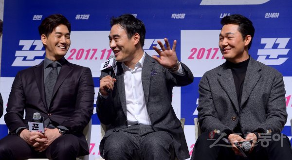 배우 배성우(가운데)가 11일 서울 강남구 신사동 CGV 압구정에서 열린 영화 ‘꾼’ 제작보고회에 참석해 사회자의 질문에 웃으며 답변하고 있다.