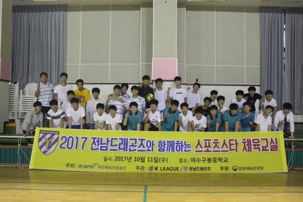 프로축구 K리그 클래식 전남드래곤즈(사장 신승재)가 11일 여수구봉중학교를 방문하여 스포츠스타와 함께하는 체육교실을 실시했다.