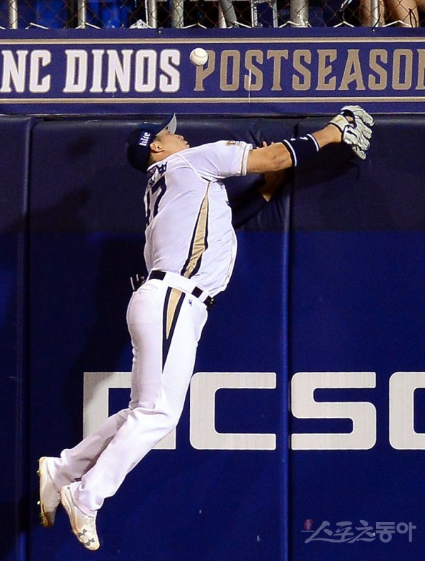 11일 창원 마산야구장에서 ‘2017 타이어뱅크 KBO리그’ 포스트시즌 준플레이오프 3차전 롯데 자이언츠와 NC 다이노스 경기가 열렸다. 2회초 무사 NC 우익수 나성범이 롯데 이대호의 타구를 잡으려 시도했으나 놓치고 있다.