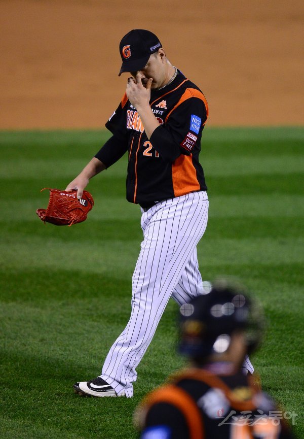 11일 창원 마산야구장에서 ‘2017 타이어뱅크 KBO리그’ 포스트시즌 준플레이오프 3차전 롯데 자이언츠와 NC 다이노스 경기가 열렸다. 선발 투수로 등판한 롯데 송승준이 1회말 3실점 한 후 더그아웃으로 들어가고 있다.