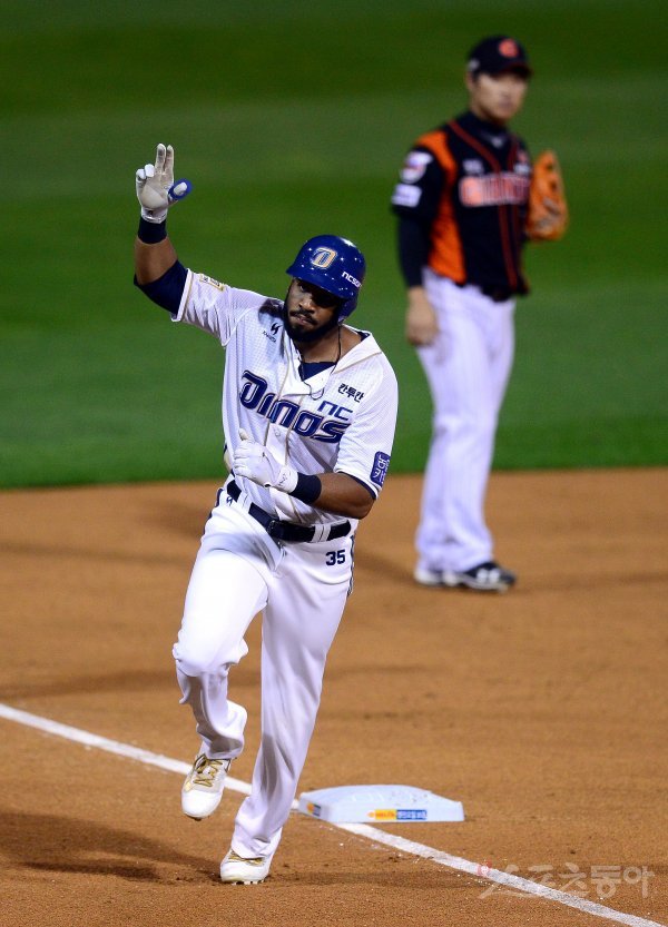 11일 창원 마산야구장에서 ‘2017 타이어뱅크 KBO리그’ 포스트시즌 준플레이오프 3차전 롯데 자이언츠와 NC 다이노스 경기가 열렸다. 1회말 2사 1루 NC 스크럭스가 중월 투런 홈런을 날리고 그라운드를 돌며 하이파이브 하고 있다.