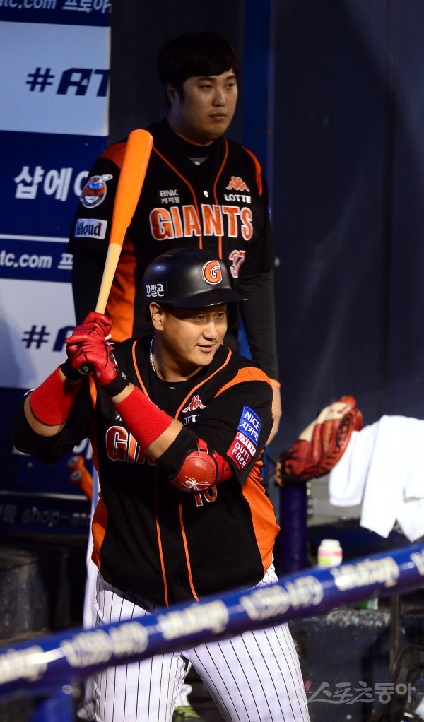 11일 창원 마산야구장에서 ‘2017 타이어뱅크 KBO리그’ 포스트시즌 준플레이오프 3차전 롯데 자이언츠와 NC 다이노스 경기가 열렸다. 롯데 이대호가 더그아웃에서 타이밍을 맞추며 몸을 풀고 있다.