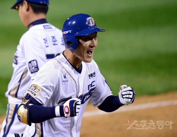 11일 창원 마산야구장에서 ‘2017 타이어뱅크 KBO리그’ 포스트시즌 준플레이오프 3차전 롯데 자이언츠와 NC 다이노스 경기가 열렸다. 3회말 2사 2루 NC 노진혁이 우중월 투런 홈런을 날리고 그라운드를 돌아 홈인해 하이파이브 하고 있다.
