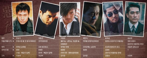 이들의 ‘계보’를 잇는 ‘범죄도시’의 윤계상은 최민식 못지않은 잔혹함으로, ‘대장 김창수’의 송승헌은 냉혹함의 이미지로 자신들의 영역을 새롭게 넓혀 놓았다.
