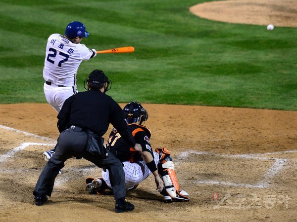11일 창원 마산야구장에서 ‘2017 타이어뱅크 KBO리그’ 포스트시즌 준플레이오프 3차전 롯데 자이언츠와 NC 다이노스 경기가 열렸다. 5회말 2사 1,3루 NC 대타 이호준이 1타점 적시타를 치고 있다.
