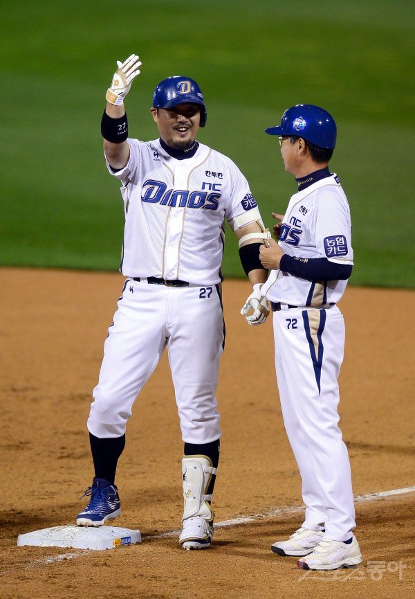 11일 창원 마산야구장에서 ‘2017 타이어뱅크 KBO리그’ 포스트시즌 준플레이오프 3차전 롯데 자이언츠와 NC 다이노스 경기가 열렸다. 5회말 2사 1,3루 NC 대타 이호준이 1타점 적시타를 치고 1루에서 기뻐하고 있다.