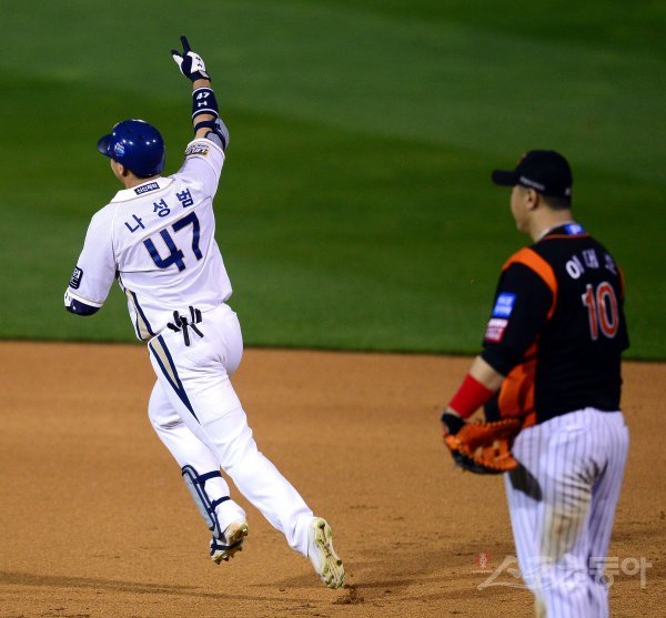 11일 창원 마산야구장에서 ‘2017 타이어뱅크 KBO리그’ 포스트시즌 준플레이오프 3차전 롯데 자이언츠와 NC 다이노스 경기가 열렸다. 5회말 무사 1루 NC 나성범이 좌중월 투런 홈런을 날리고 그라운들 돌며 환호하고 있다.