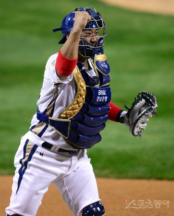 11일 창원 마산야구장에서 ‘2017 타이어뱅크 KBO리그’ 포스트시즌 준플레이오프 3차전 롯데 자이언츠와 NC 다이노스 경기가 열렸다. 6회초 1사 만루 롯데 박헌도 우익수 플라이 아웃 때 3루주자 전준우가 태그업 시도했으나 NC 포수 김태군이 태그아웃 시킨 후 포효하고 있다.