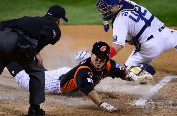 11일 창원 마산야구장에서 ‘2017 타이어뱅크 KBO리그’ 포스트시즌 준플레이오프 3차전 롯데 자이언츠와 NC 다이노스 경기가 열렸다. 6회초 1사 만루 롯데 박헌도 우익수 플라이 아웃 때 3루주자 전준우가 태그업 시도했으나 홈에서 태그아웃 되고 있다.