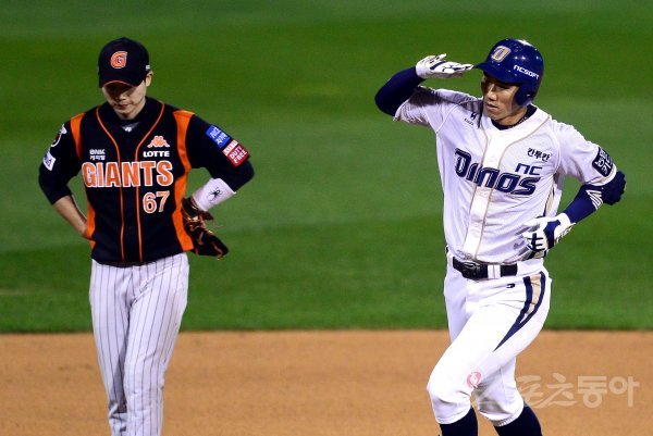 11일 창원 마산야구장에서 ‘2017 타이어뱅크 KBO리그’ 포스트시즌 준플레이오프 3차전 롯데 자이언츠와 NC 다이노스 경기가 열렸다. 6회말 2사 NC 모창민이 좌중월 솔로 홈런을 날리고 그라운드를 돌며 기뻐하고 있다.