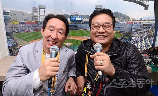 이성득 KNN 해설위원(왼쪽)과 최효석 부산MBC 해설위원은 롯데의 전 경기를 커버하며 ‘부산의 목소리’로 불린다. 롯데의, 롯데를 위한, 롯데에 의한 해설로 부산 야구팬들의 귀를 사로잡고 있다. 마산 | 김종원 기자 won@donga.com