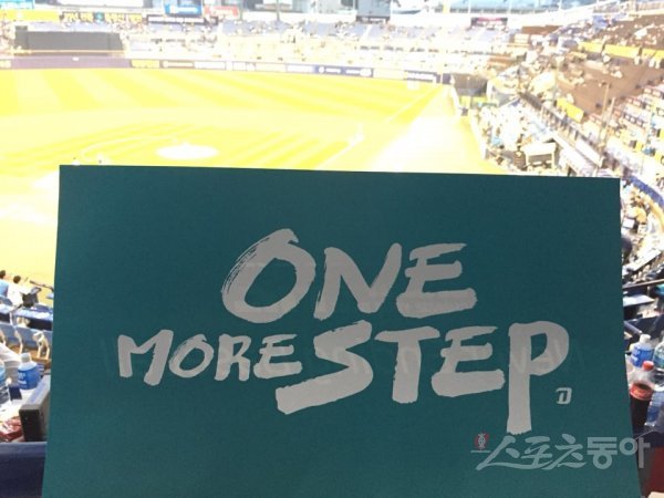 11일 롯데-NC의 준플레이오프(준PO) 3차전을 앞둔 마산구장에서 발견한 홈팀 NC의 응원 피켓. 올 시즌 NC의 포스트시즌(PS) 캐치프레이즈인 ‘가을이야기’의 서브 슬로건 ‘ONE MORE STEP’이 선명하다. NC는 창단 첫 PS에 진출한 2014시즌 준PO에서 탈락했지만, 2015년 PO, 2016년 한국시리즈(KS)를 경험하며 매년 한 단계씩 높이 올라갔다. 올해는 정규시즌 4위(79승 3무 62패)를 기록해 와일드카드 결정전부터 시작했지만, 차근차근 단계를 밟아 나가며 첫 우승을 차지하길 기대하고 있다. 은퇴를 앞두고 마지막 PS를 치르는 이호준과 선수단이 팬들에게 전하는 키워드이기도 하다.