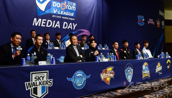 12일 서울 강남 리베라호텔에서 열린 ‘2017-2018 도드람 V리그’ 미디어데이에 참석한 7개 구단 감독 및 대표 선수들이 출사표를 밝히고 있다.