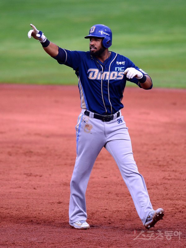 15일 부산 사직야구장에서 ‘2017 타이어뱅크 KBO리그’ 포스트시즌 준플레이오프 5차전 롯데 자이언츠와 NC 다이노스 경기가 열렸다. 5회초 무사 1,2루 NC 스크럭스가 선제 1타점 중전 안타를 치고 1루에서 기뻐하고 있다.