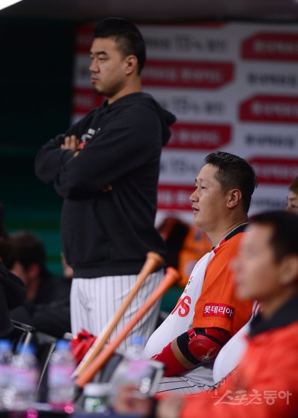 15일 부산 사직야구장에서 ‘2017 타이어뱅크 KBO리그’ 포스트시즌 준플레이오프 5차전 롯데 자이언츠와 NC 다이노스 경기가 열렸다. 롯데 이대호와 송승준이 그라운드를 바라보고 있다.