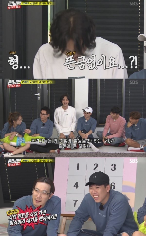 이날 이광수는 벌칙을 함께 할 멤버 선정을 위한 게임에 돌입했다. 이런 가운데 그는 조력자 두 명의 도움을 받게 됐고 레이스 마지막 이들의 정체를 밝혀낸 멤버는 벌칙 동행에서 면제 혜택을 받는다.