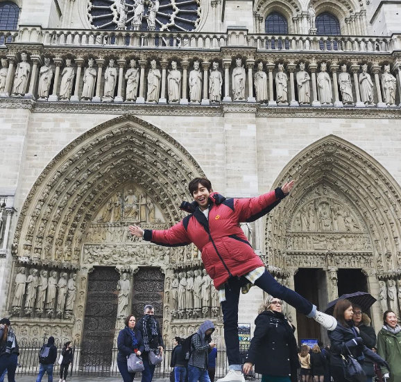 사진 속 정용화는 유럽의 성을 배경으로 역동적인 포즈를 취한 모습. 스포티한 패션스타일 속에서도 빛나는 미모가 인상적이다.