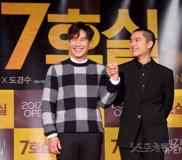 배우 신하균과 도경수(EXO 디오)가 16일 서울 광진구 롯데시네마 건대입구에서 열린 영화 ‘7호실’ 제작보고회에서 포즈를 취하고 있다.