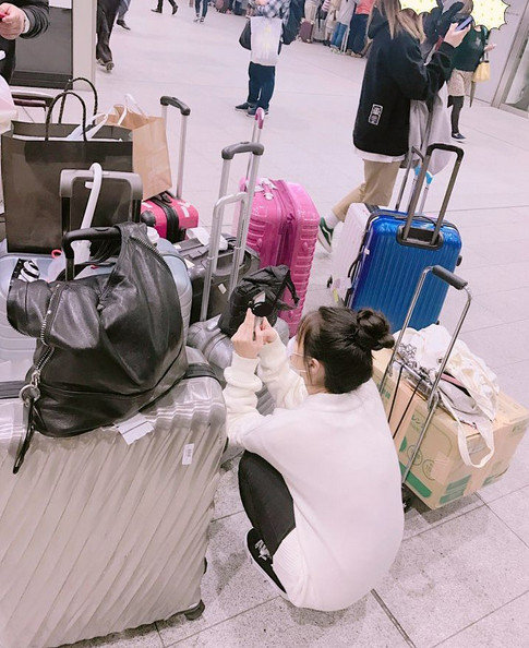 한승연은 15일 자신의 인스타그램에 "현실은 #쭈글쭈글 #japan #osaka 일본 따뜻하다고 누가 그랬음?#雨女" 라는 글과 함께 사진 한 장을 게재했다. 사진 속 한승연은 짐꾸러미 사이에서 쪼그리고 앉아있는 모습이다.