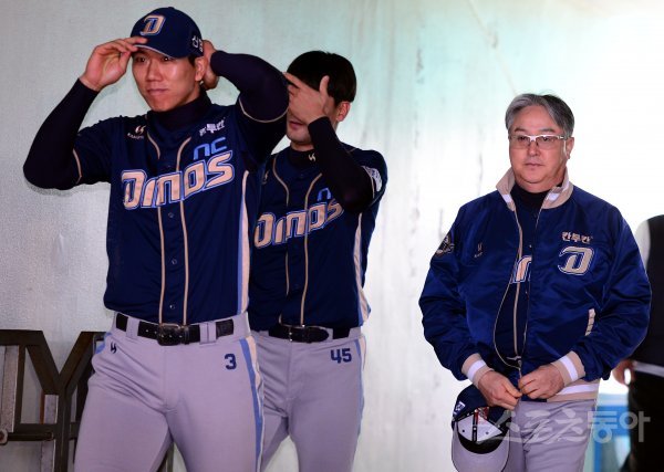 NC 김경문 감독 및 선수들이 기자회견장으로 들어서고 있다.