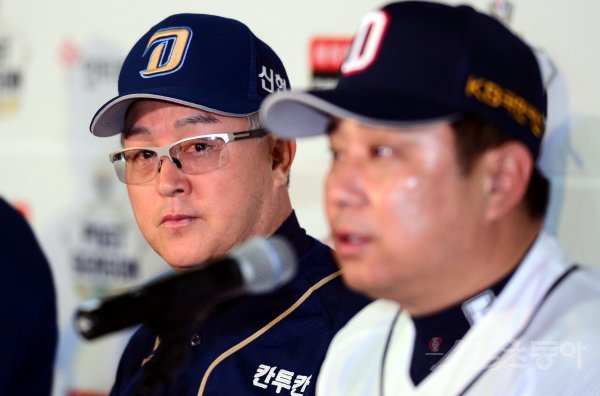 NC 김경문 감독이 두산 김태형 감독의 기자회견을 바라보고 있다.