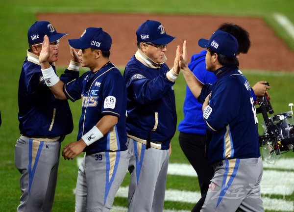 15일 부산 사직야구장에서 \'2017 타이어뱅크 KBO리그\' 포스트시즌 준플레이오프 5차전 롯데 자이언츠와 NC 다이노스 경기가 열렸다. 9-0 대승을 거두며 플레이오프 진출을 확정 지은 NC 김경문 감독이 선수들과 하이파이브 하고 있다. 사직 | 김종원 기자 won@donga.com