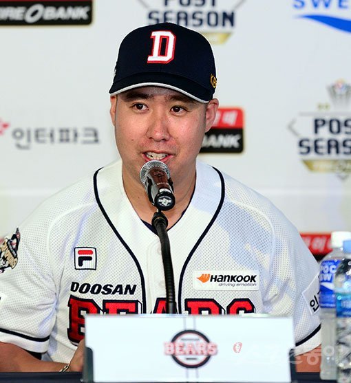 16일 서울 잠실야구장에서 ‘2017 타이어뱅크 KBO리그‘ 두산 베어스와 NC 다이노스의 플레이오프 미디어데이가 열렸다. 두산 유희관이 출사표를 밝히고 있다. 잠실 | 김민성 기자 marineboy@donga.com