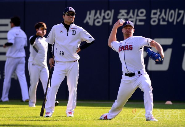 17일 서울 잠실야구장에서 ‘2017 타이어뱅크 KBO리그’ 두산 베어스와 NC 다이노스의 플레이오프 1차전 경기가 열린다. 경기 전 두산 한용덕 코치가 보우덴의 투구를 살펴보고 있다.