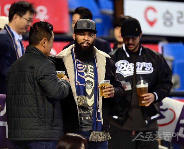 17일 서울 잠실야구장에서 ‘2017 타이어뱅크 KBO리그’ 포스트시즌 플레이오프 1차전 NC 다이노스와 두산베어스 경기가 열렸다. 경기 전 NC 타자 테임즈(밀워키 블루어스)가 경기장을 방문해 관전하고 있다.