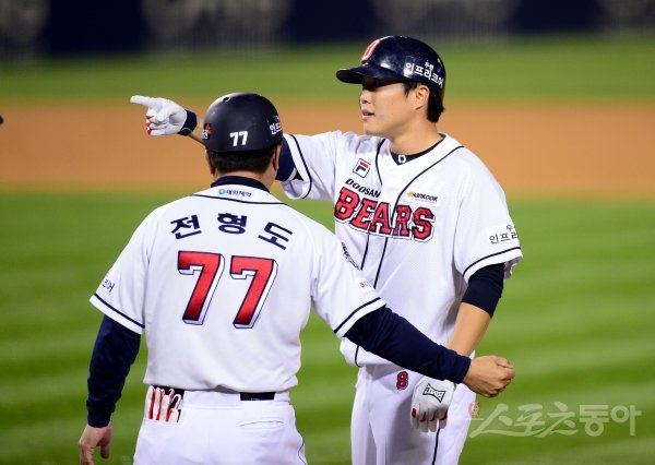 17일 서울 잠실야구장에서 ‘2017 타이어뱅크 KBO리그’ 두산 베어스와 NC 다이노스의 플레이오프 1차전 경기가 열렸다. 4회말 2사 1, 3루에서 두산 류지혁이 1타점 적시타를 날린 뒤 환호하고 있다.