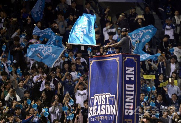 17일 서울 잠실야구장에서 ‘2017 타이어뱅크 KBO리그’ 두산 베어스와 NC 다이노스의 플레이오프 1차전 경기가 열렸다. 테임즈가 리프트를 타고 NC를 응원하고 있다.
