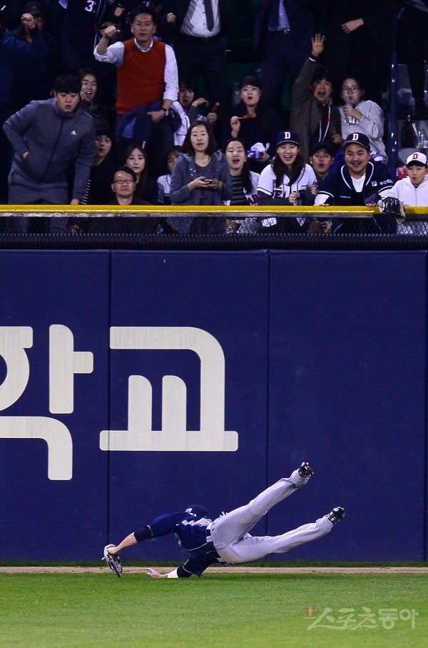 17일 잠실구장에서 벌어진 NC-두산의 PO 1차전. 2-1로 앞서던 NC는 4회말 선발투수 장현식의 갑작스러운 난조로 2-4 역전을 허용했다. 계속된 2사 1·3루 위기. 민병헌 타석에서 맨쉽이 구원 등판했다. 민병헌은 2구째를 통타해 좌중간을 가르는 2루타성 타구를 날렸다. 그 순간 김준완의 폭풍질주가 펼쳐졌다. 제자리에서 30m 가량을 내달린 김준완은 혼신을 다해 몸을 날렸고, 거짓말처럼 타구는 글러브로 빨려 들어갔다. 1루쪽 두산 응원석에선 아쉬움의 탄성이, 3루쪽 NC 응원석에선 뜨거운 환호가 교차했다.