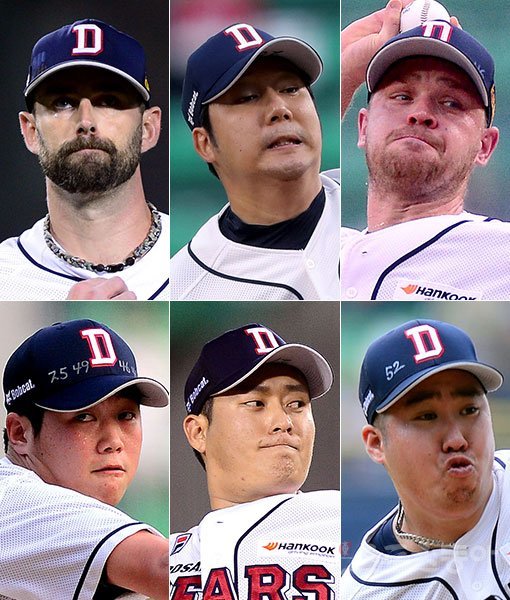 두산 니퍼트-장원준-보우덴-유희관-김강률-함덕주(왼쪽 상단부터 시계방향으로). 스포츠동아DB